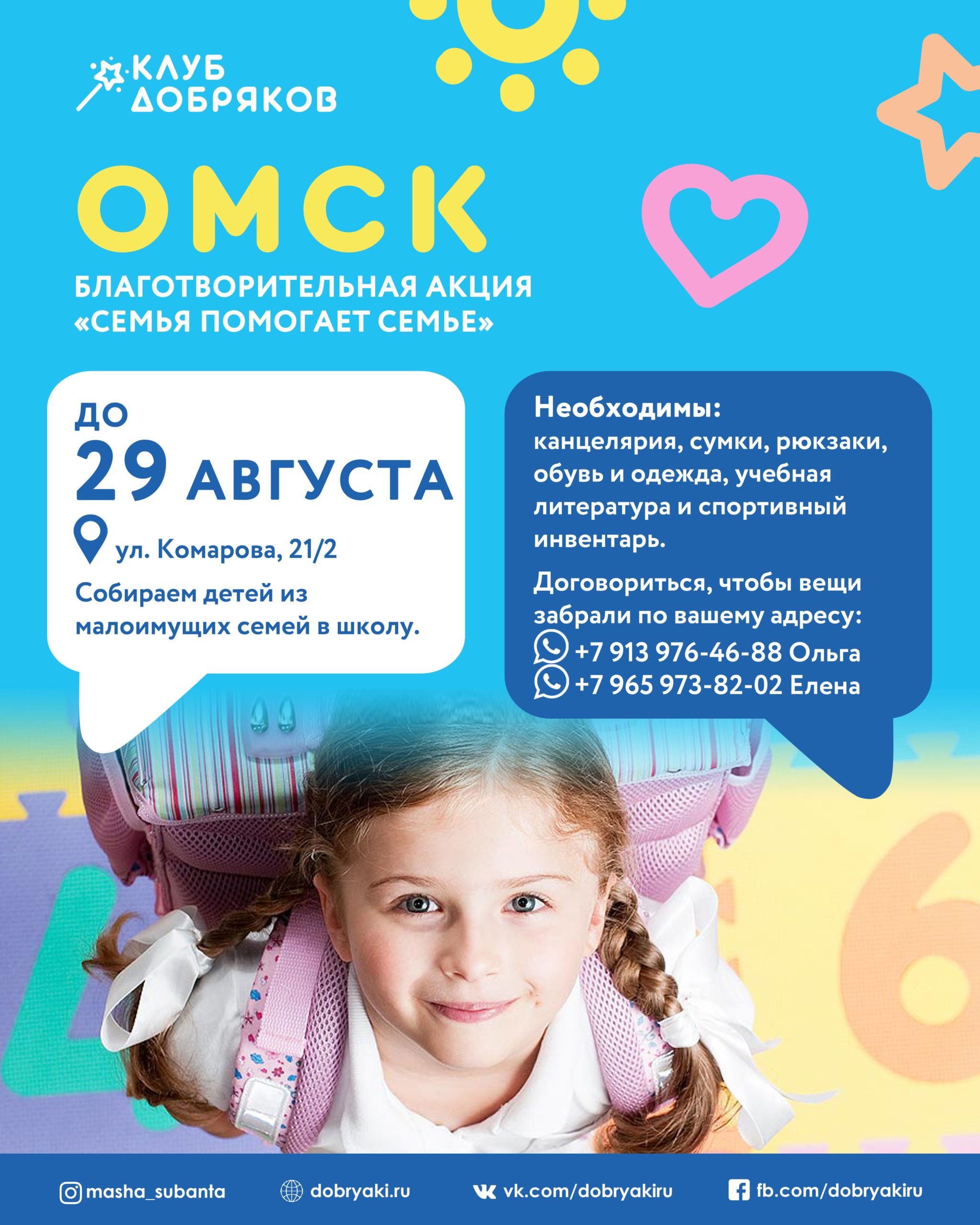 Специально для них в Омске до конца августа проходит благотворительная акция «Семья помогает семье». Любой желающий может помочь собрать ребенка в школу. Для этого достаточно передать что-нибудь из этого списка: канцелярские принадлежности, сумки, рюкзаки, обувь и одежду, учебную литературу для детей всех школьных возрастов и спортивный инвентарь.
